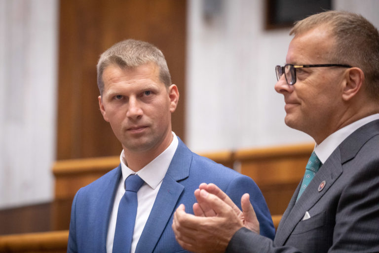 Zľava: Poslanec NR SR za hnutie Obyčajní ľudia a nezávislé osobnosti (OĽaNO) Peter Cseh a predseda NR SR Boris Kollár počas skladania sľubu v rámci rokovania 72. schôdze Národnej rady SR. Bratislava, 4. október 2022. Foto: SITA/Diana Černáková