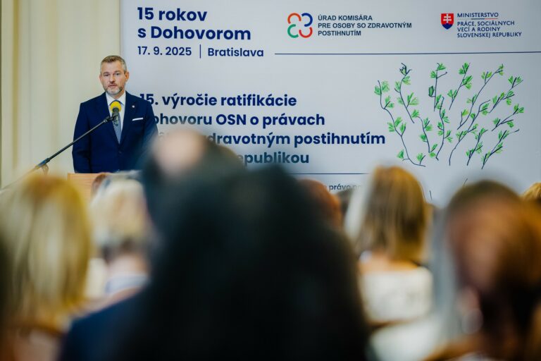 Prezident SR Peter Pellegrini v príhovore počas konferencie v Hoteli Bôrik k 15. výročiu ratifikácie Dohovoru o právach osôb so zdravotným postihnutím. Bratislava, 17. september 2025. Foto: SITA/Kancelária prezidenta SR