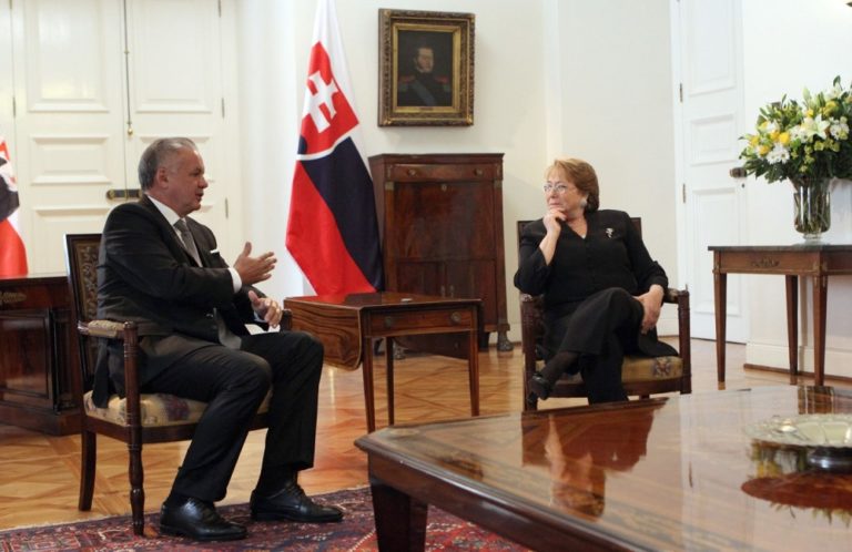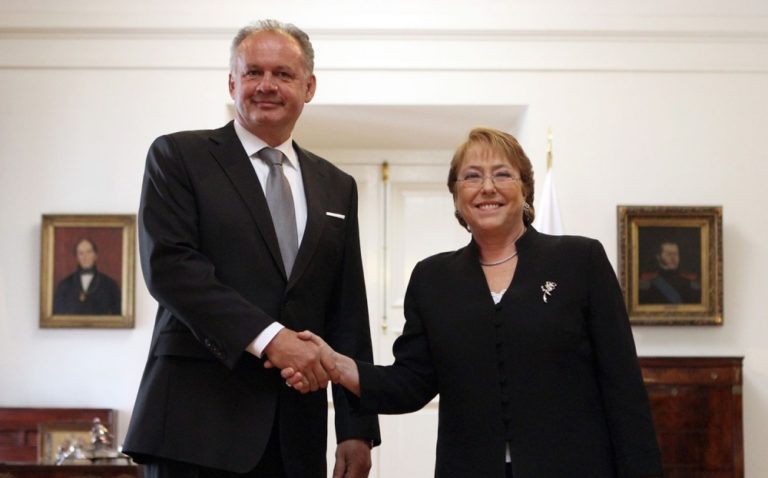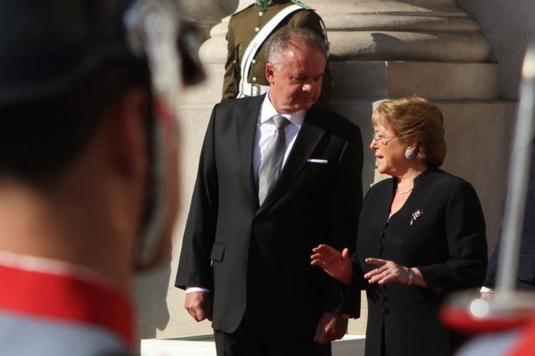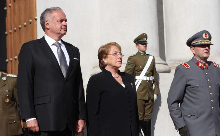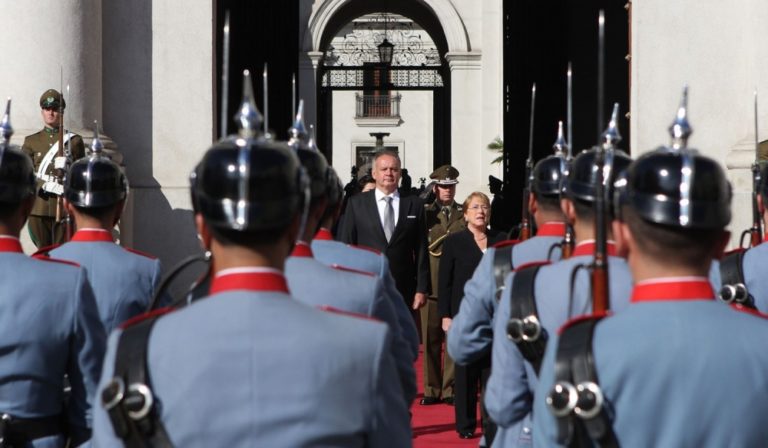 Čilská prezidentka Michelle Bacheletová (v strede) a slovenský prezident Andrej Kiska (vľavo) počas spoločného stretnutia v rámci oficiálnej návštevy prezidenta SR v Čile. Čilská republika, 2. august 2016. Foto: SITA//Kancelária prezidenta SR