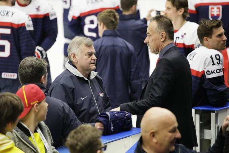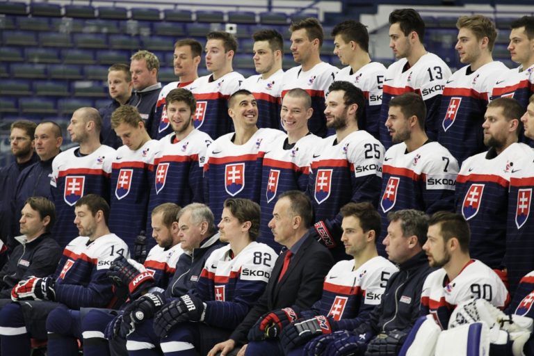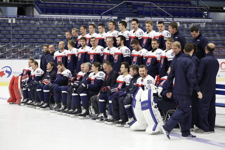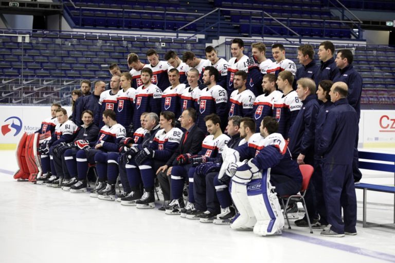 Tréner slovenskej hokejovej reprezentácie Vladimír Vůjtek (uprostred vľavo) a prezident Slovenského zväzu ľadového hokeja (SZĽH) Igor Nemeček (uprostred vpravo) pred oficiálnym fototermínom slovenskej reprezentácie počas majstrovstiev sveta v ľadovom hokeji 2015 v Českej republike. Ostrava, Česká republika, 4. máj 2015. Foto: SITA/Ján Viazanička