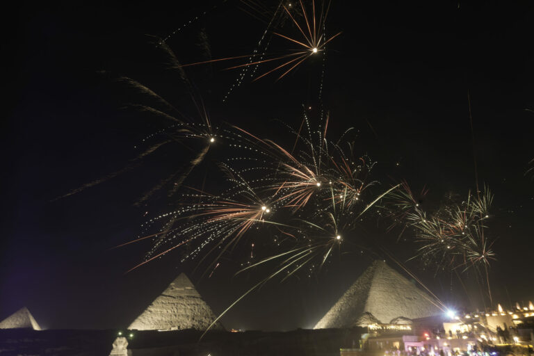 Novoročný ohňostroj nad pyramídami v Gíze v Egypte. Foto: SITA/AP.