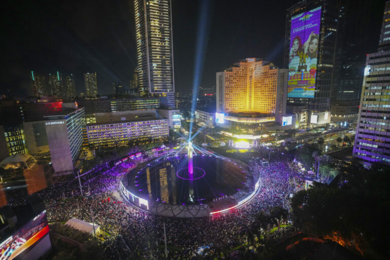 Ľudia vítajú nový rok v Jakarte, kde ich čakala svetelná šou. Foto: SITA/AP.