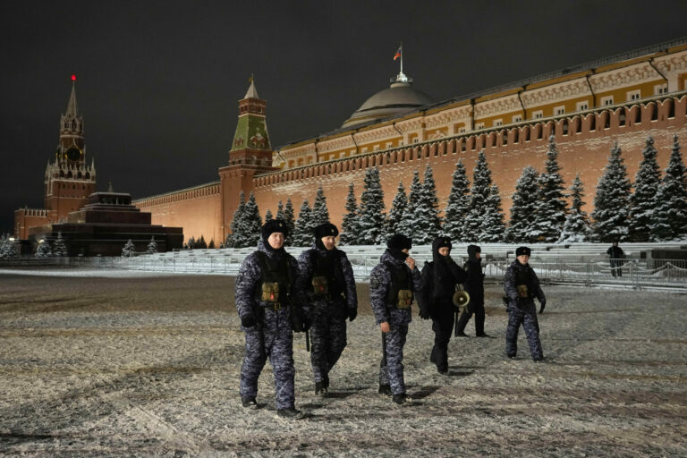 Polícia a Rosgvardia sa prechádzajú po Červenom námestí v Moskve, ktoré je z dôvodu novoročných osláv uzatvorené. Foto: SITA/AP