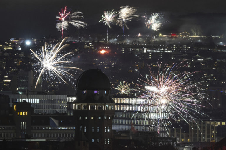 Ohňostroj a vítanie Nového roku 2024 v Zurichu vo Švajčiarsku. Foto: Ennio Leanza/Keystone via AP