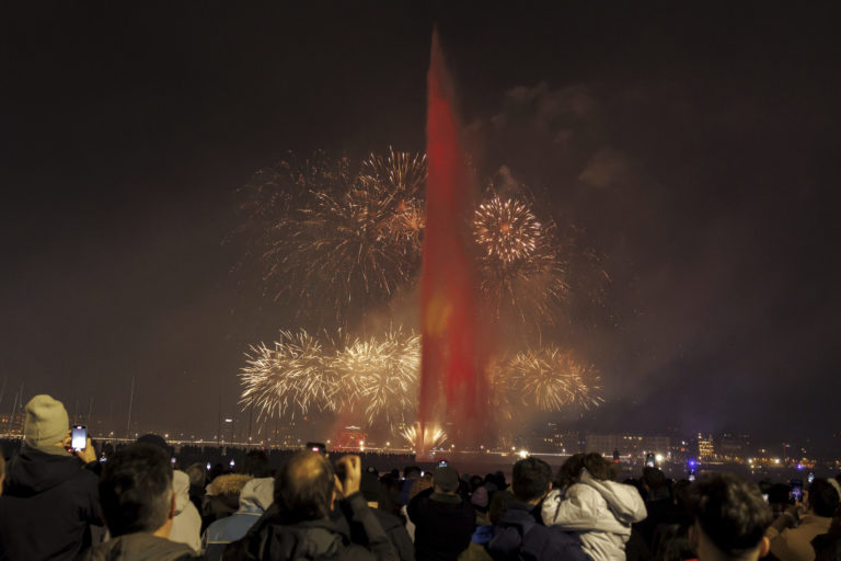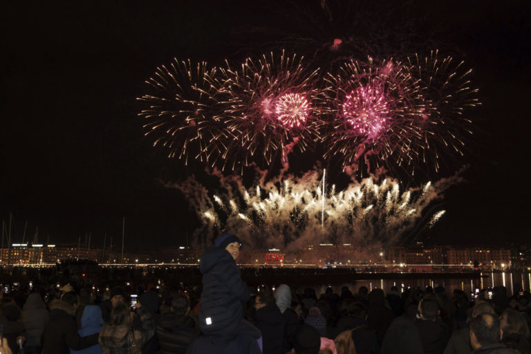 Ohňostroj a vítanie Nového roku 2024 v meste Geneva vo Švajčiarsku. Foto: Salvatore Di Nolfi/Keystone via AP