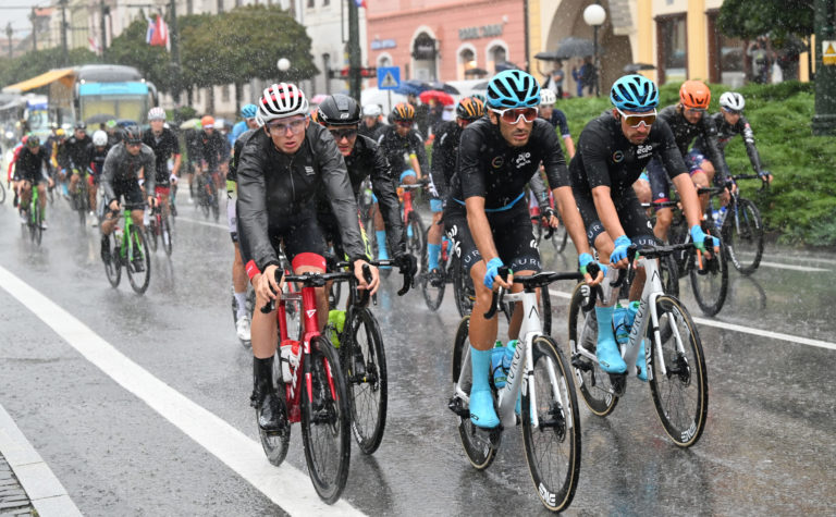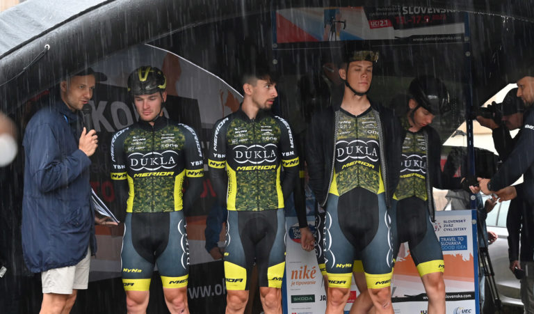 Tím Dukly Banská Bystrica počas 2. etapy 67. ročníka medzinárodných cyklistických pretekov kategórie UCI 2.1 Okolo Slovenska 2023. Prešov, 14. september 2023. ENERGETIKA: ÚRSO zaslal vláde konkrétne návrhy na ochranu domácností ohrozených energetickou chudobou