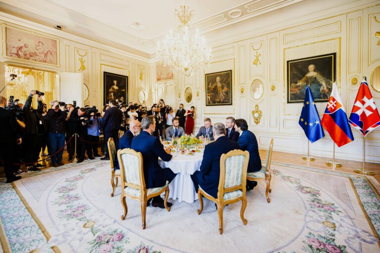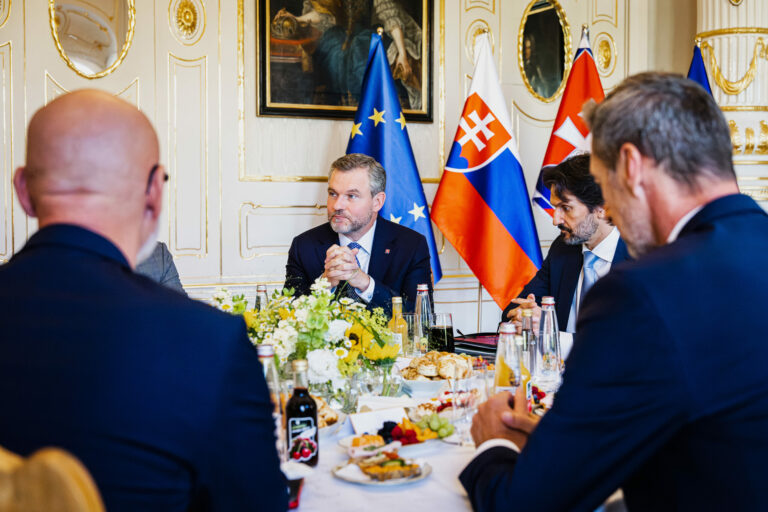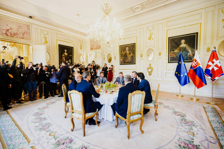 Sprava za stolom: Predseda Kresťanskodemokratickej strany (KDH) Milan Majerský, podpredseda vlády SR a minister obrany SR Robert Kaliňák, prezident SR Peter Pellegrini a predseda strany Sloboda a Solidarita (SaS) Branislav Gröhling počas rokovania prezidenta SR a predsedov parlamentných strán za okrúhlym stolom v Prezidentskom paláci k otázke bezpečnosti pred samitom Severoatlantickej aliancie (NATO) v Haagu, na ktorom sa zúčastní prezident SR. Bratislava, 17. jún 2025. Foto: SITA/Kancelária prezidenta SR