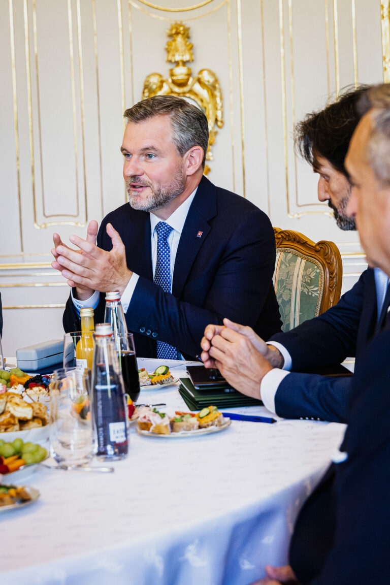 Prezident SR Peter Pellegrini počas rokovania s predsedami parlamentných strán za okrúhlym stolom v Prezidentskom paláci k otázke bezpečnosti pred samitom Severoatlantickej aliancie (NATO) v Haagu, na ktorom sa zúčastní prezident SR. Bratislava, 17. jún 2025. Foto: SITA/Kancelária prezidenta SR
