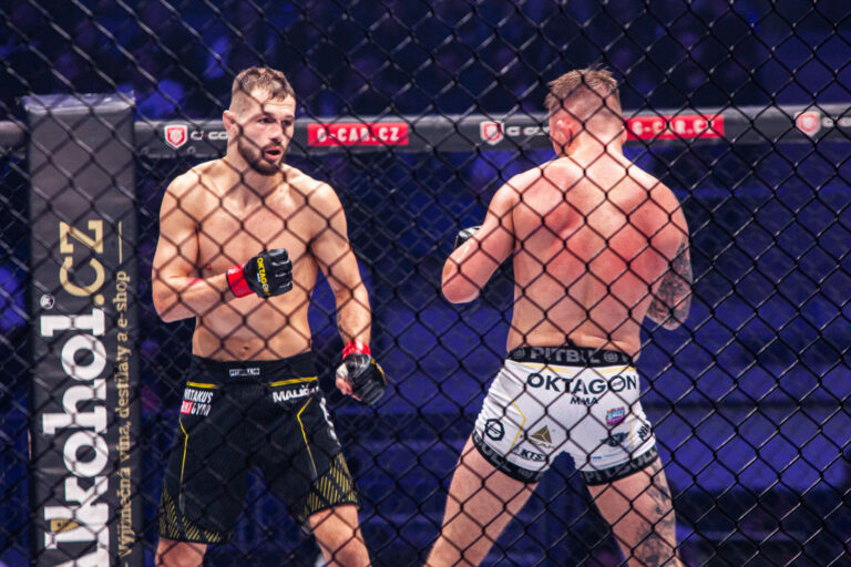 Tomáš Cigánik (SVK) a Kevin Enz (GER) počas zápasu v MMA (zmiešané bojové umenie) v rámci zápasového večera Oktagon 63 v priestoroch Zimného štadióna Ondreja Nepelu v Bratislave. Bratislava, 9. november 2024. Foto: SITA/Bokor Tomáš