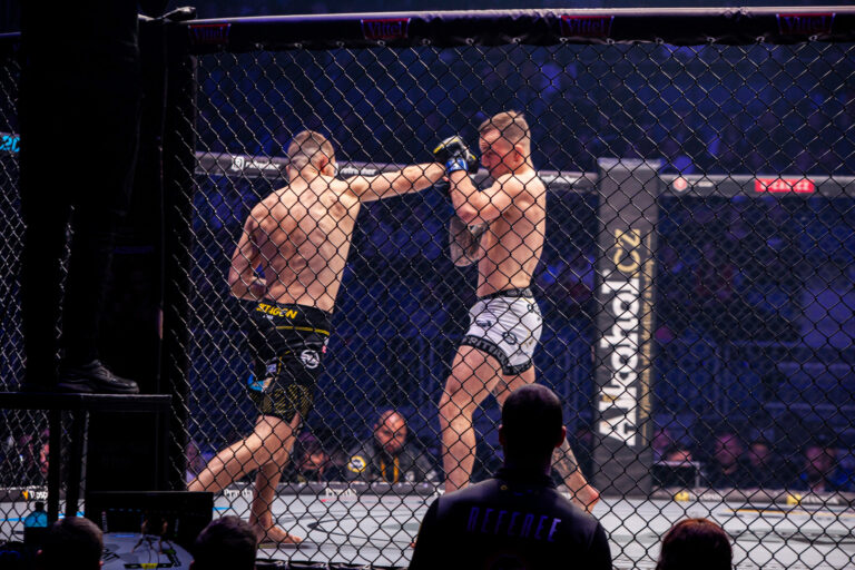 Tomáš Cigánik - čierna (SVK) a Kevin Enz - biela (GER) počas zápasu v MMA (zmiešané bojové umenie) v rámci zápasového večera Oktagon 63 v priestoroch Zimného štadióna Ondreja Nepelu v Bratislave. Bratislava, 9. november 2024. Foto: SITA/Bokor Tomáš