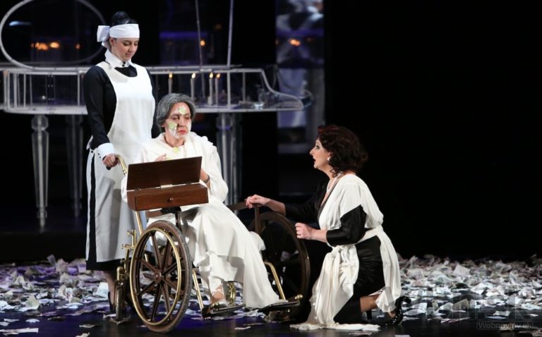 Nesmrteľná téma boja o moc ožije v novinke prvej opernej scény Slovenska, v opere Piotra Iľjiča Čajkovského Piková dáma. Na snímke Katarína Flórová (Máša), Jitka Sapara-Fischerová (Grófka), Adriana Kohútková (Líza). Bratislava, 20. máj 2014. Foto: SITA/SND/Jozef Barinka