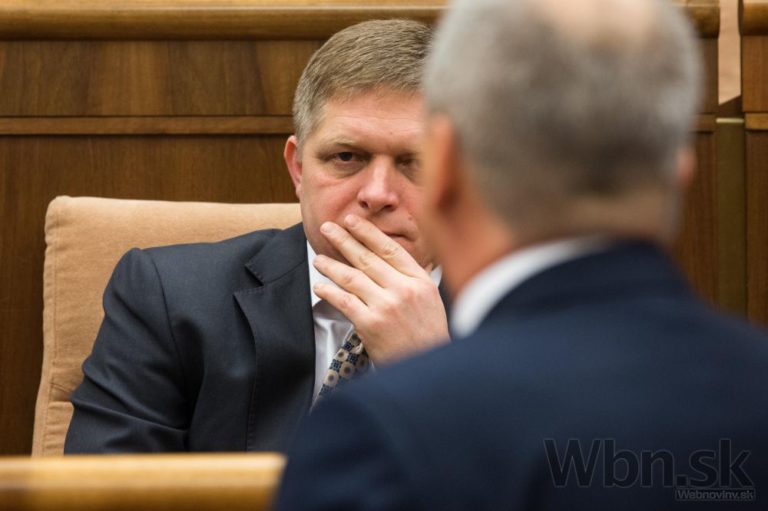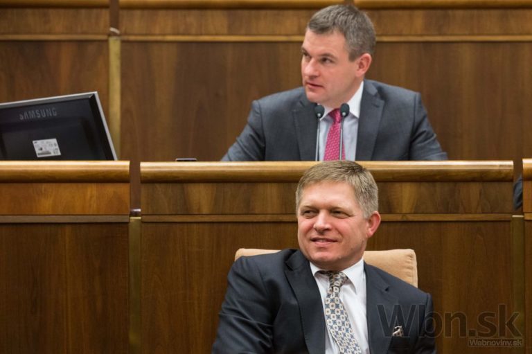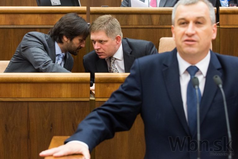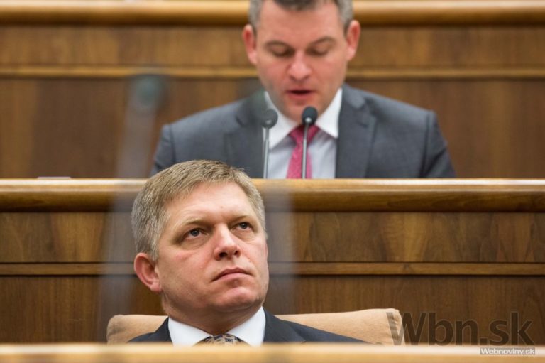 Predseda vlády SR Robert Fico (vľavo) počas rokovania 45. schôdze Národnej rady SR s návrhom skupiny poslancov NR SR na vyslovenie nedôvery ministrovi dopravy, výstavby a regionálneho rozvoja SR. Bratislava, 12. december 2014. Foto: SITA/Jozef Jakubčo