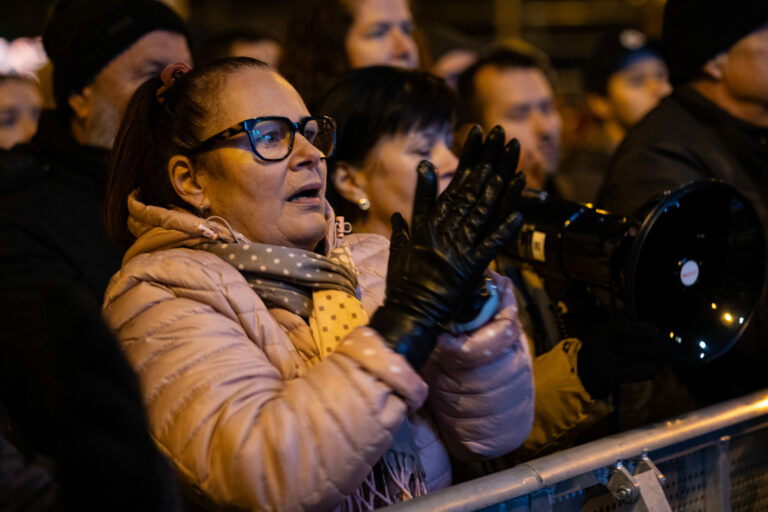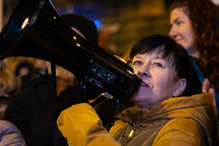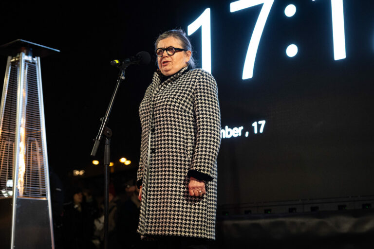 Herečka Zuzana Krónerová počas podujatia Nežné korzo pri príležitosti 35. výročia Nežnej revolúcie na Námestí Nežnej revolúcie v Bratislave. Bratislava, 17. november 2024. Foto: SITA/Jana Birošová.