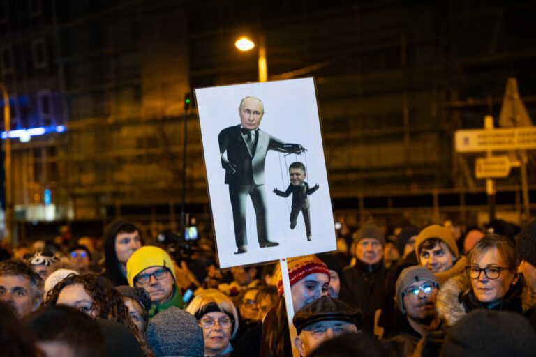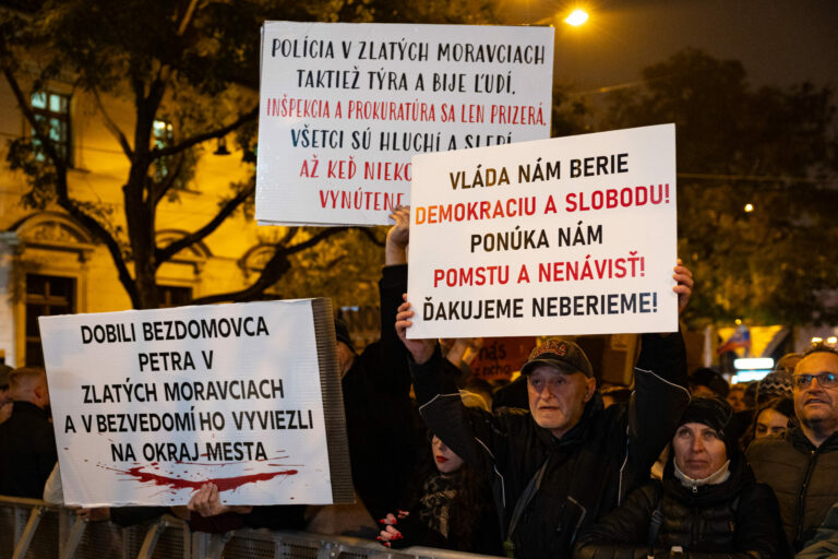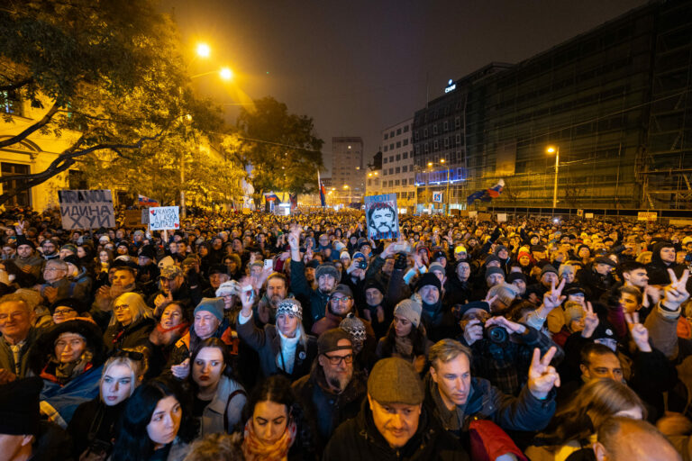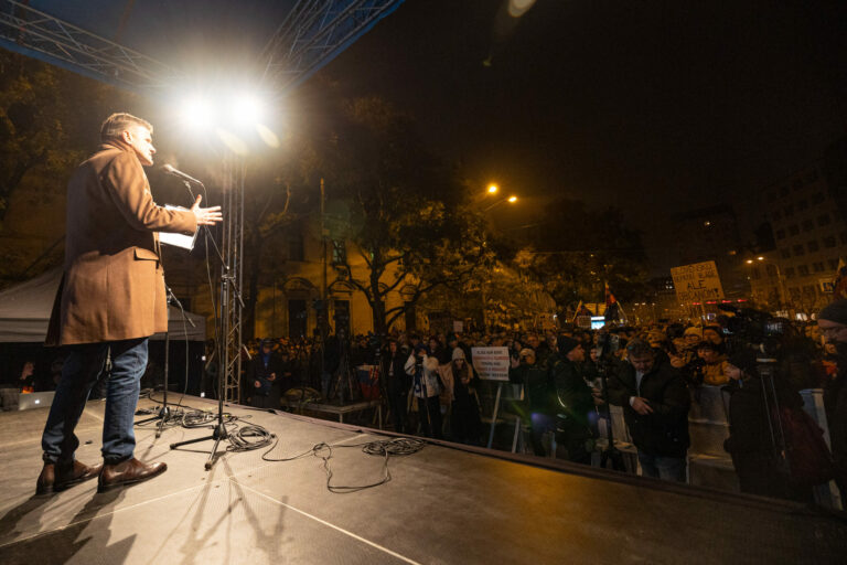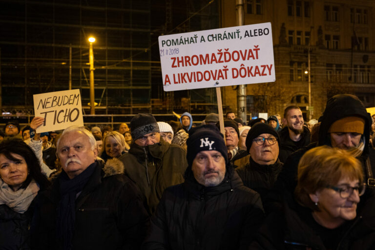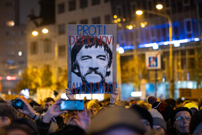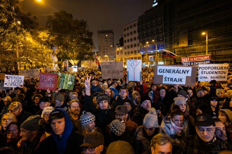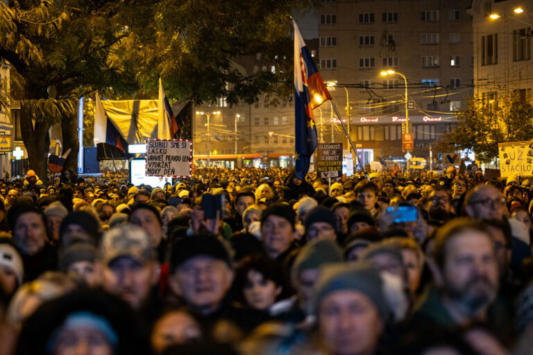 Účastníci počas zhromaždenia pri príležitosti 35. výročia Nežnej revolúcie na Námestí Slovenského národného povstania (SNP) v Bratislave. Bratislava, 17. november 2024. Foto: SITA/Jana Birošová.