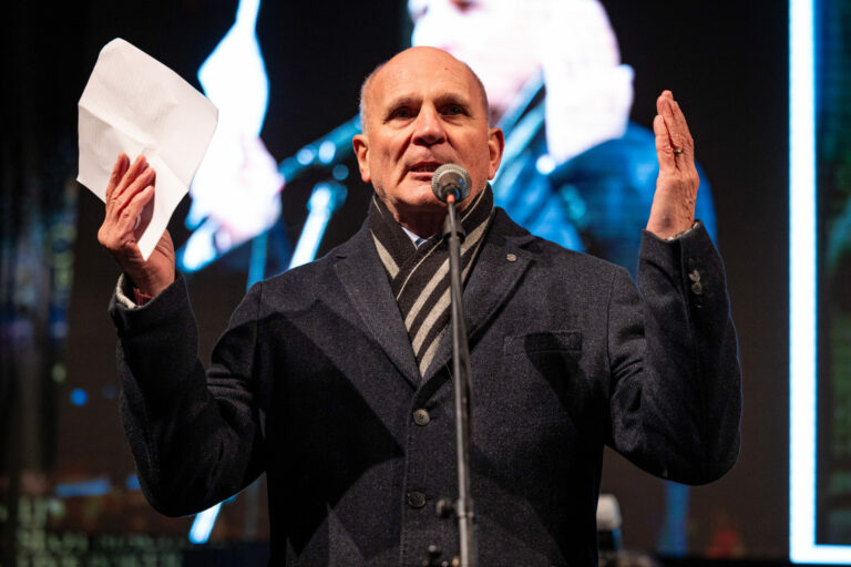 Poslanec NR SR za Kresťanskodemokratické hnutie (KDH) František Mikloško počas zhromaždenia pri príležitosti 35. výročia Nežnej revolúcie na Námestí Slovenského národného povstania v Bratislave. Bratislava, 17. november 2024. Foto: SITA/Jana Birošová.