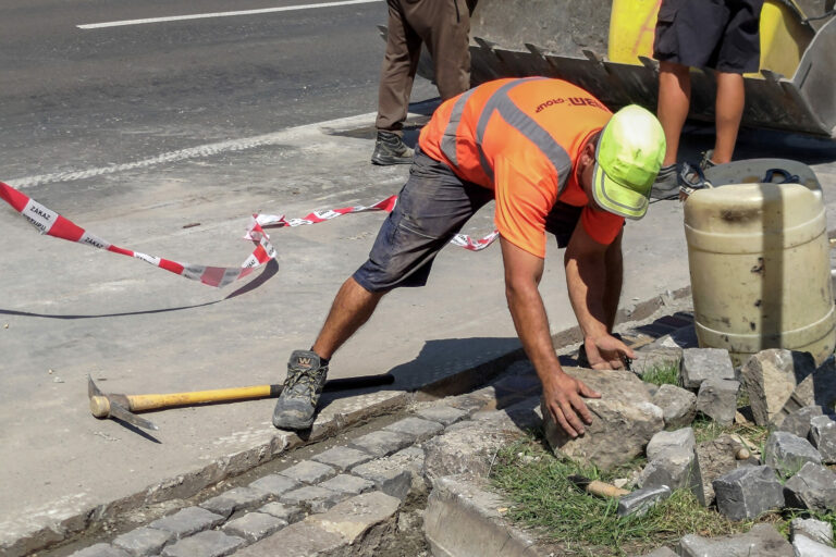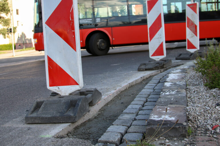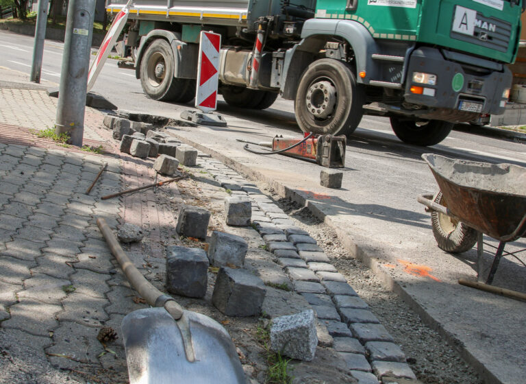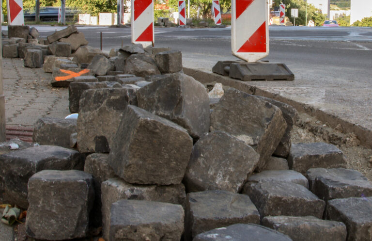 Rekonštrukcia križovatky Saratovská-Repašského-Drobného v bratislavskej Dúbravke, ktorej súčasťou je spevnenie podložia, výmena povrchov vozovky, výmena poškodených obrubníkov a výmena a výšková úprava vývodov inžinierskych sietí. Bratislava, 24. júl 2025. Foto: SITA/Andrea Mezeiová