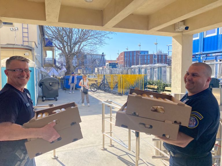 Rc Košice Slovensko pripravuje bagety pre utečenecké centrum na železničnej stanici v Košiciach a mestská polícia pomáha s rozvozom. Foto: Archiv Rotary Distriktu 2240