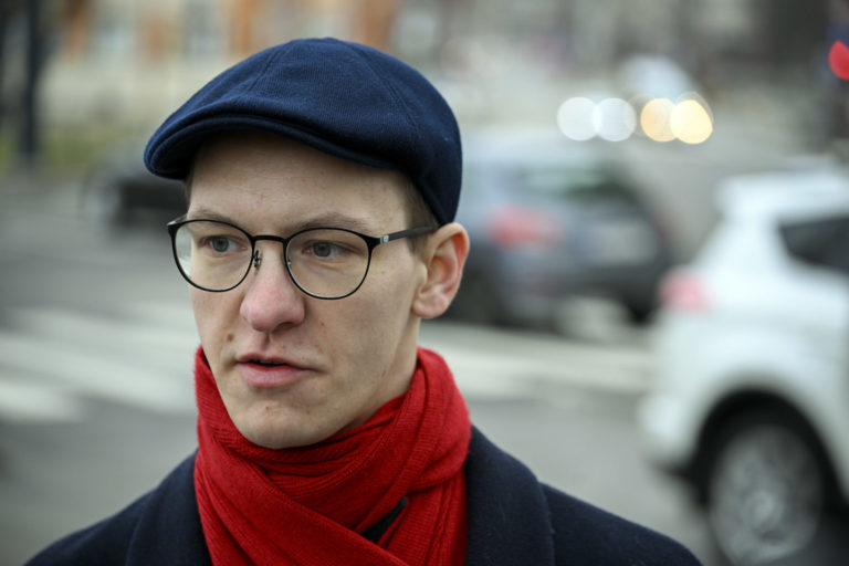 Dan Kollár z občianského združenia Cyklokoalícia počas tlačového brífingu občianskych združení Cyklokoalícia a Znepokojené matky na zastávke MHD Račianske mýto v Bratislave na tému: Kvalita ovzdušia v Bratislave. Bratislava, 9. február 2024. Foto: SITA/Milan Illík