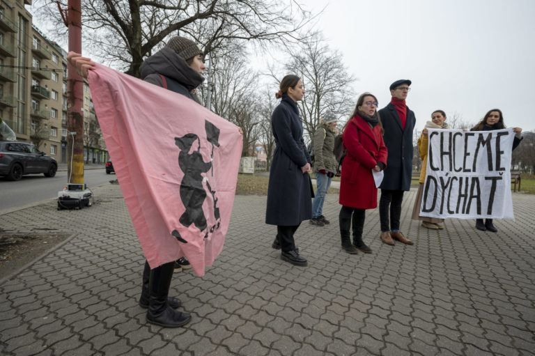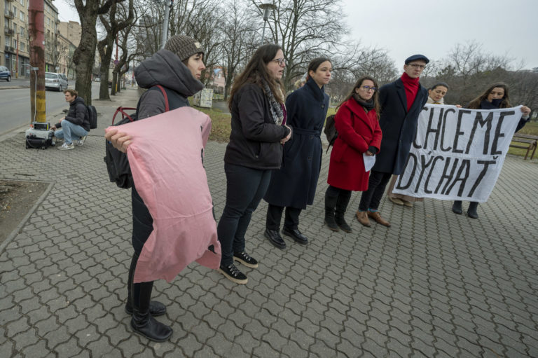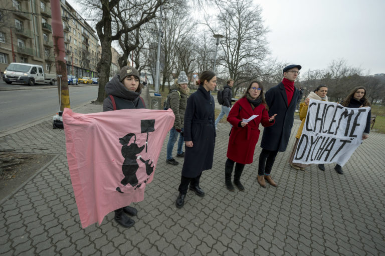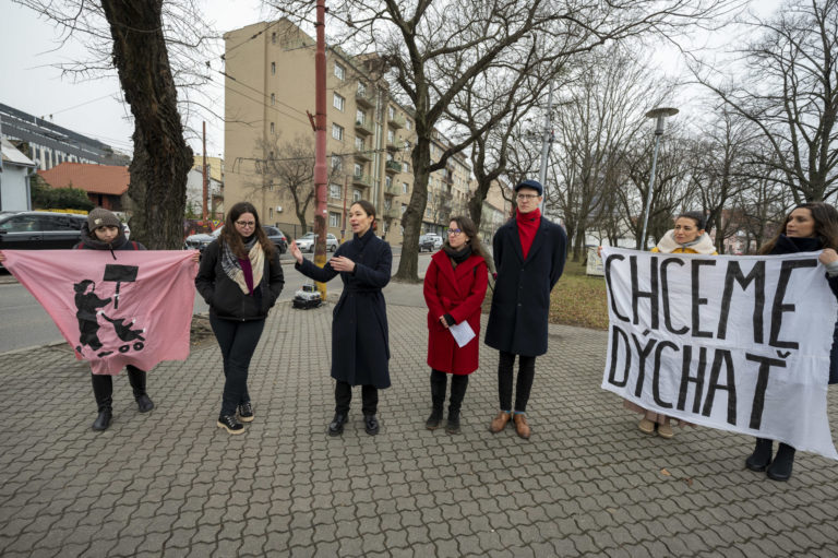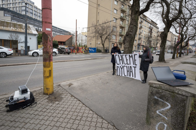 Atmosféra počas tlačového brífingu občianskych združení Cyklokoalícia a Znepokojené matky na zastávke MHD Račianske mýto v Bratislave na tému: Kvalita ovzdušia v Bratislave. Bratislava, 9. február 2024. Foto: SITA/Milan Illík