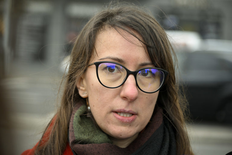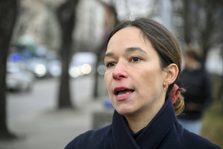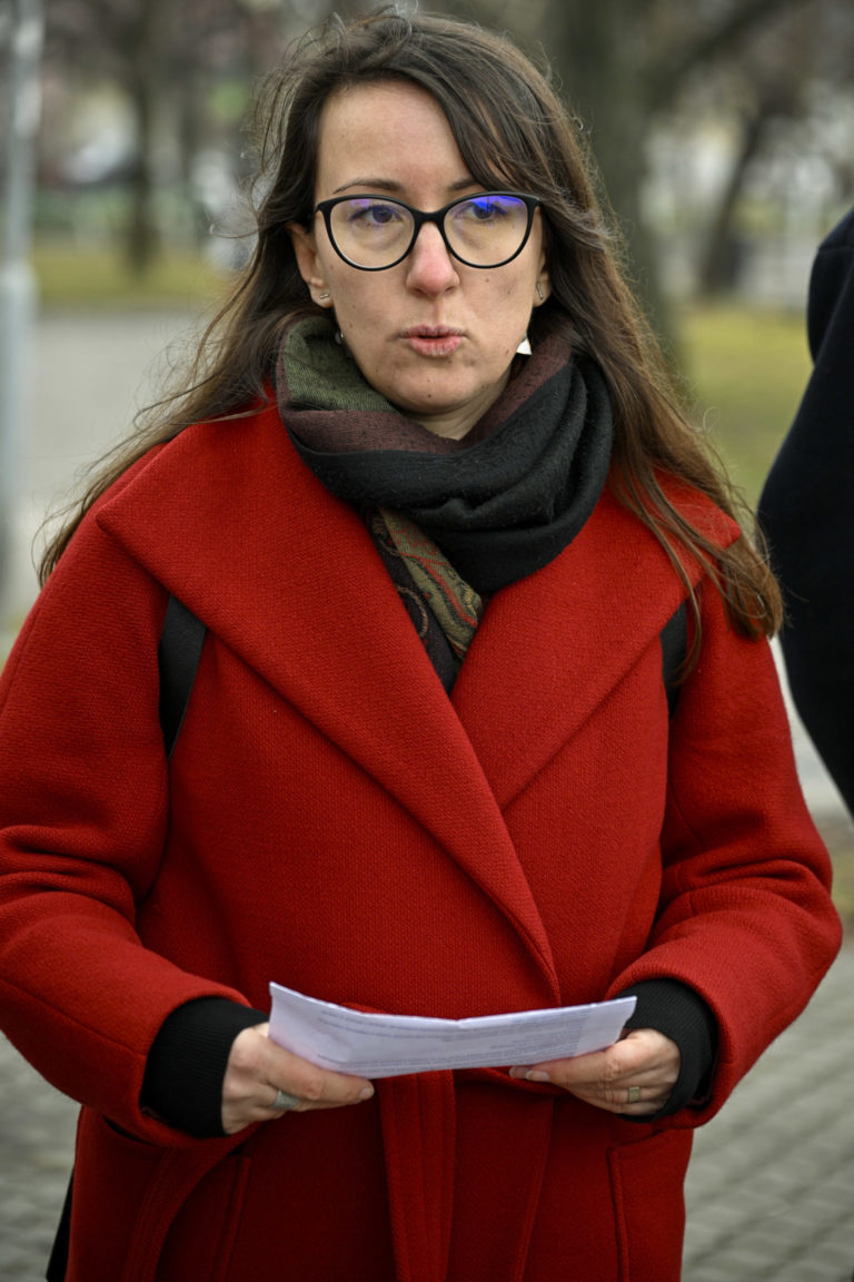 Hana Rhein z Deutsche Umhelthilfe počas tlačového brífingu občianskych združení Cyklokoalícia a Znepokojené matky na zastávke MHD Račianske mýto v Bratislave na tému: Kvalita ovzdušia v Bratislave. Bratislava, 9. február 2024. Foto: SITA/Milan Illík