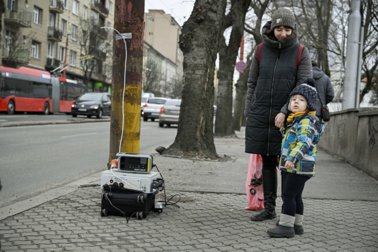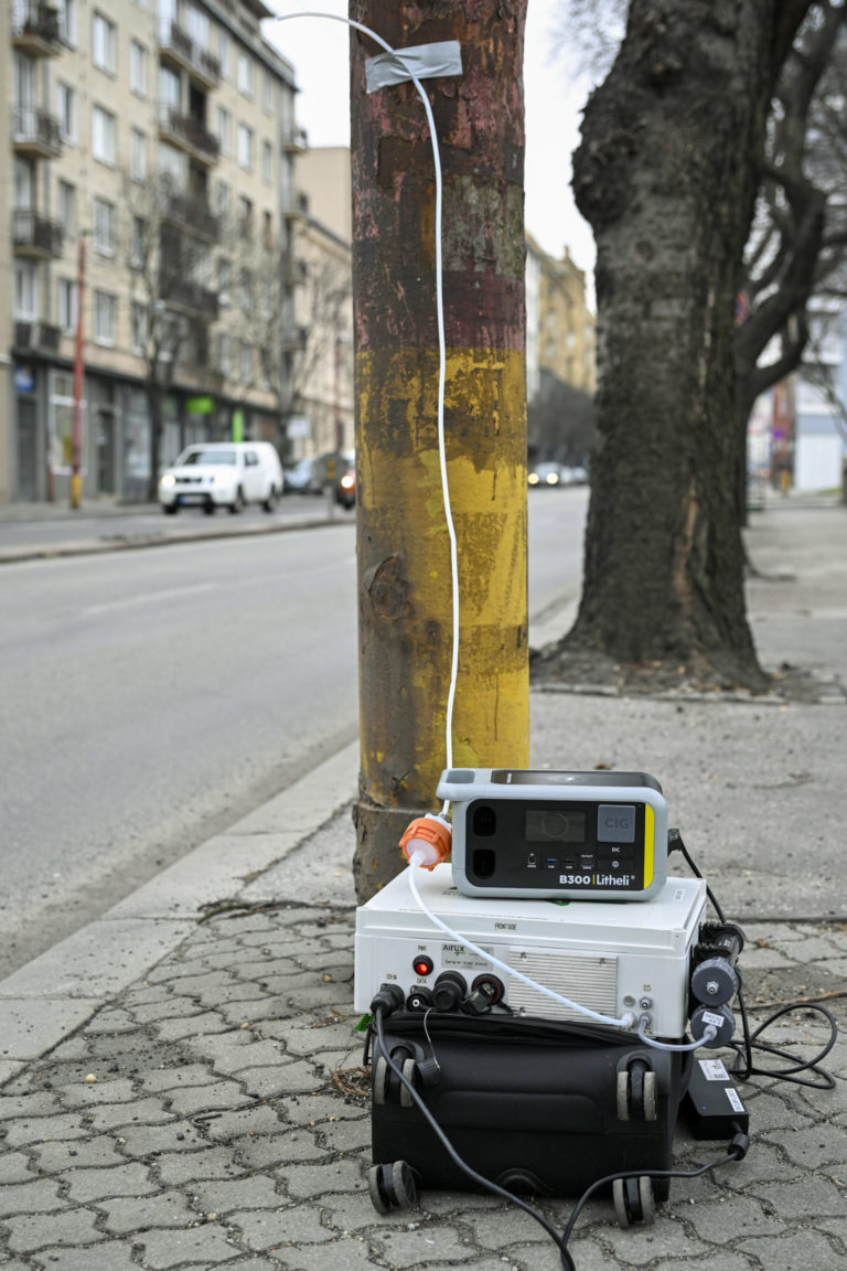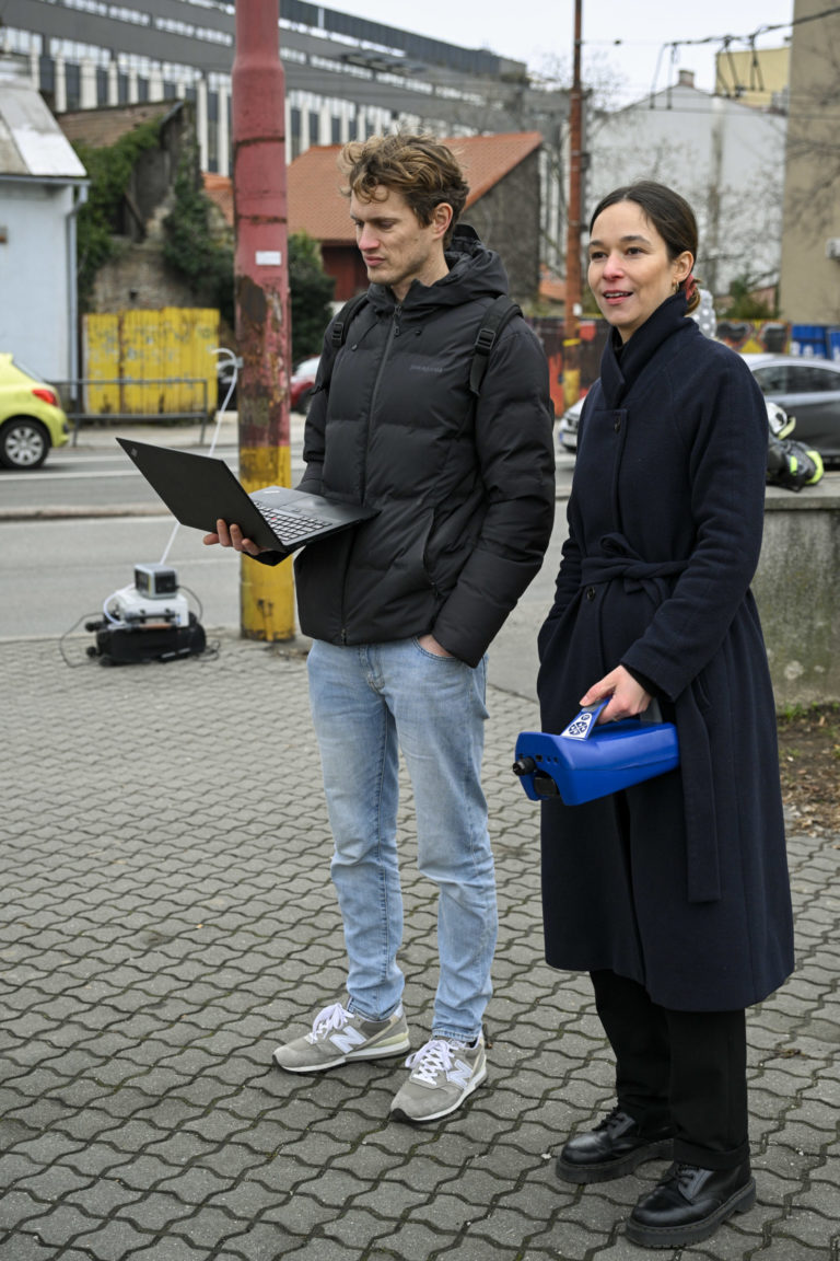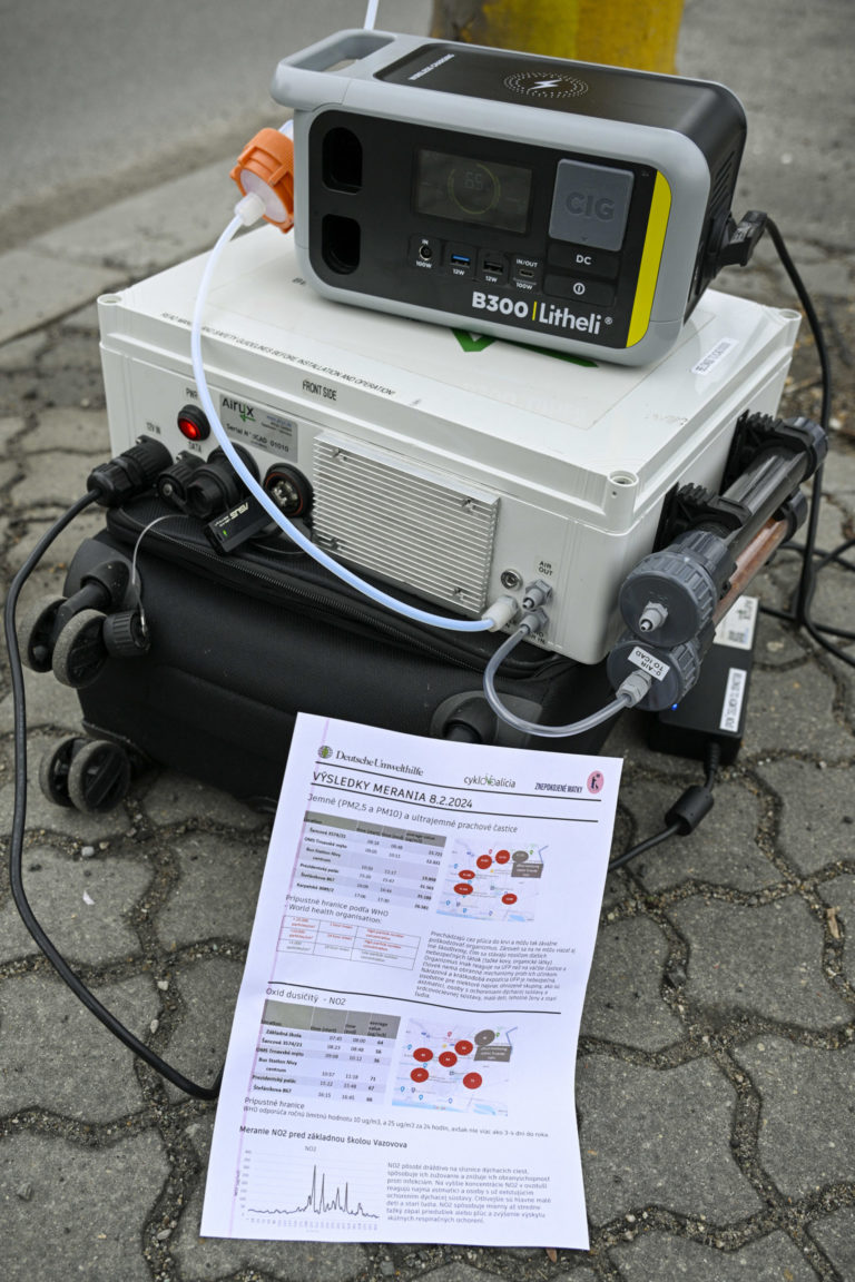 Prístroj na meranie znečistenia ovzdušia počas tlačového brífingu občianskych združení Cyklokoalícia a Znepokojené matky na zastávke MHD Račianske mýto v Bratislave na tému: Kvalita ovzdušia v Bratislave. Bratislava, 9. február 2024. Foto: SITA/Milan Illík