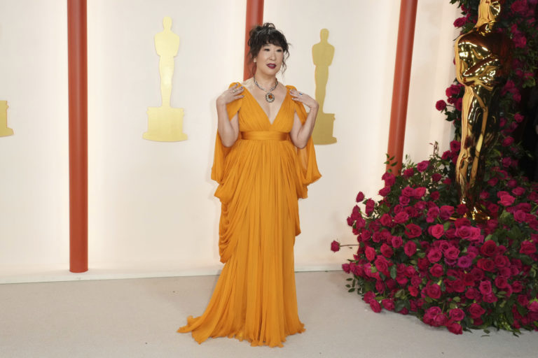Sandra Oh počas príchodu na 95. ročník udeľovania cien americkej Akadémie filmových umení a vied (Oscar 2023). Los Angeles (Dolby Theatre), 12. marec 2023. Foto: Jordan Strauss/Invision/AP.