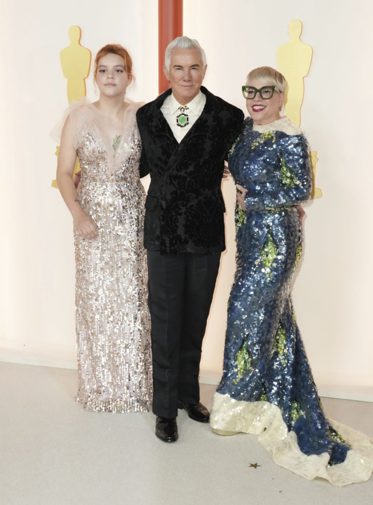 Lilly Luhrmann, Baz Luhrmann a Catherine Martin počas príchodu na 95. ročník udeľovania cien americkej Akadémie filmových umení a vied (Oscar 2023). Los Angeles (Dolby Theatre), 12. marec 2023. Foto: Jordan Strauss/Invision/AP.