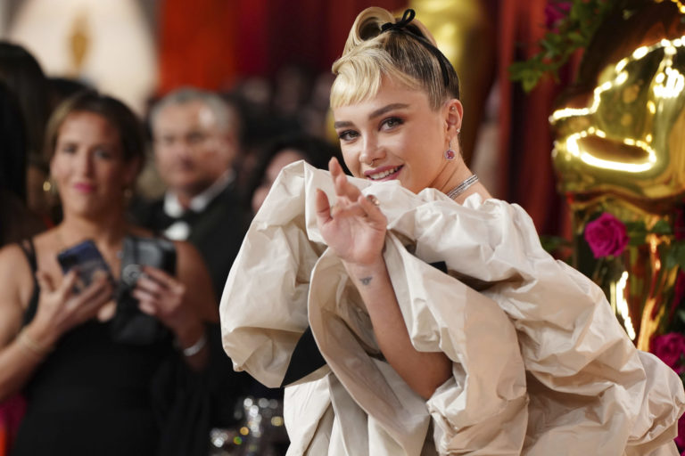 Florence Pugh počas príchodu na 95. ročník udeľovania cien americkej Akadémie filmových umení a vied (Oscar 2023). Los Angeles (Dolby Theatre), 12. marec 2023. Foto: Jordan Strauss/Invision/AP.