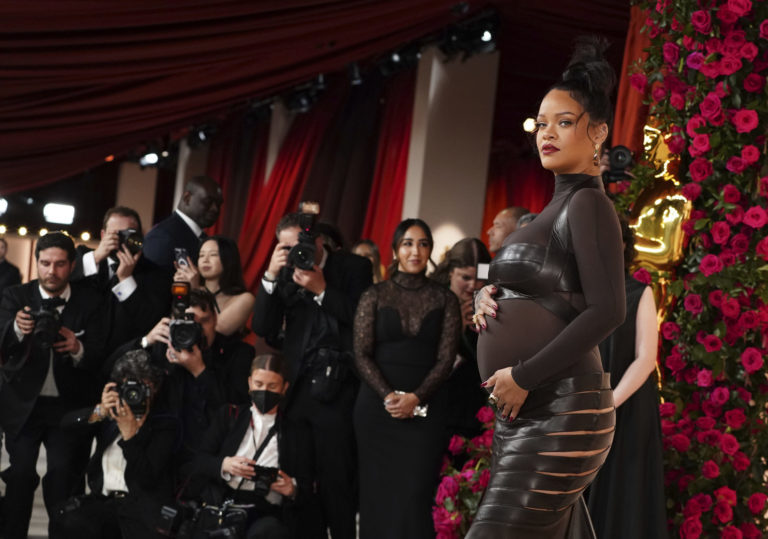 Rihanna počas príchodu na 95. ročník udeľovania cien americkej Akadémie filmových umení a vied (Oscar 2023). Los Angeles (Dolby Theatre), 12. marec 2023. Foto: Jordan Strauss/Invision/AP.