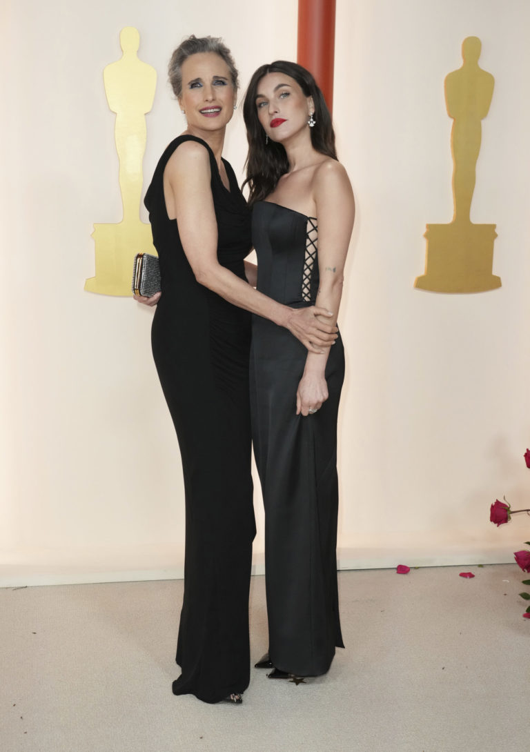 Andie MacDowell a Rainey Qualley počas príchodu na 95. ročník udeľovania cien americkej Akadémie filmových umení a vied (Oscar 2023). Los Angeles (Dolby Theatre), 12. marec 2023. Foto: Jordan Strauss/Invision/AP.