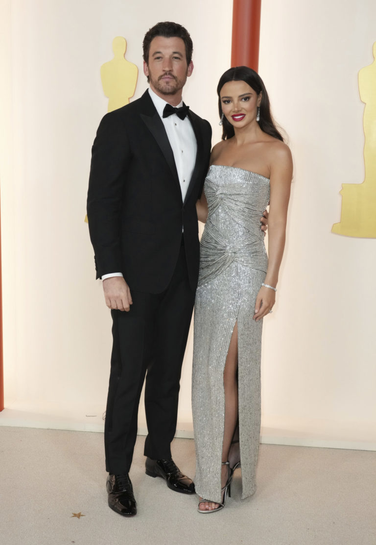 Miles Teller a Keleigh Sperry počas príchodu na 95. ročník udeľovania cien americkej Akadémie filmových umení a vied (Oscar 2023). Los Angeles (Dolby Theatre), 12. marec 2023. Foto: Jordan Strauss/Invision/AP.
