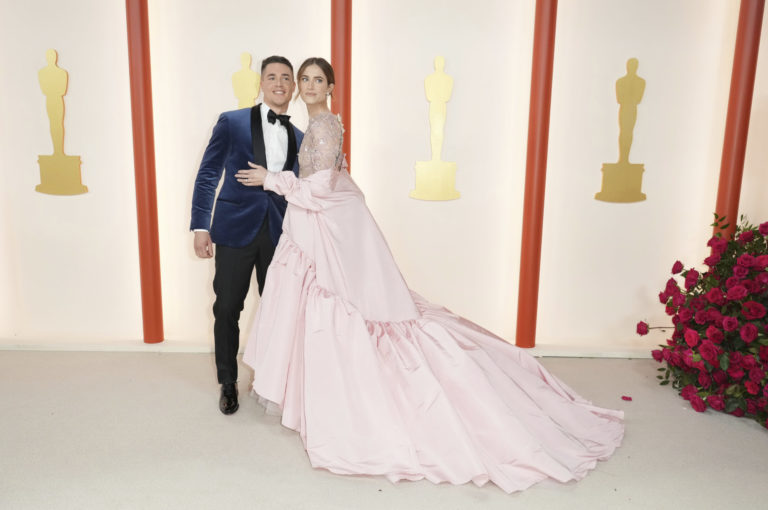 Becky Scheinert a Daniel Scheinert počas príchodu na 95. ročník udeľovania cien americkej Akadémie filmových umení a vied (Oscar 2023). Los Angeles (Dolby Theatre), 12. marec 2023. Foto: Jordan Strauss/Invision/AP.