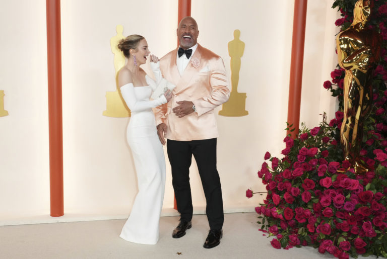 Emily Blunt a Dwayne Johnson počas príchodu na 95. ročník udeľovania cien americkej Akadémie filmových umení a vied (Oscar 2023). Los Angeles (Dolby Theatre), 12. marec 2023. Foto: Jordan Strauss/Invision/AP.