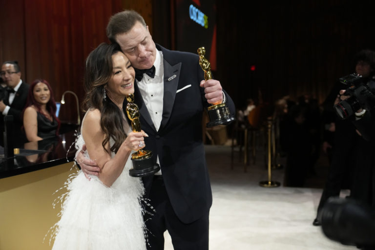 Michelle Yeoh (vľavo) a Brendan Fraser počas 95. ročníka udeľovania cien americkej Akadémie filmových umení a vied (Oscar 2023). Los Angeles (Dolby Theatre), 12. marec 2023. Foto: SITA/AP.