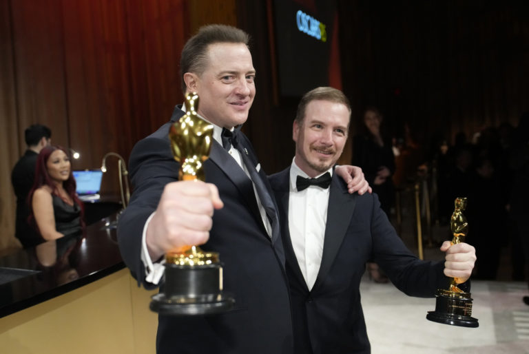 Brendan Fraser (vľavo) a Adrien Morot, počas 95. ročníka udeľovania cien americkej Akadémie filmových umení a vied (Oscar 2023). Los Angeles (Dolby Theatre), 12. marec 2023. Foto: SITA/AP.