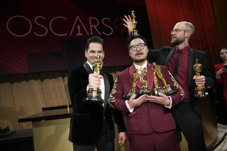 Zľava: Jonathan Wang, Daniel Kwan a Daniel Scheinert počas 95. ročníka udeľovania cien americkej Akadémie filmových umení a vied (Oscar 2023). Los Angeles (Dolby Theatre), 12. marec 2023. Foto: SITA/AP.