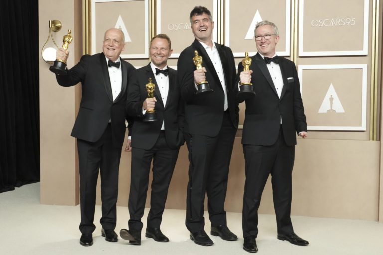 Zľava: Joe Letteri, Richard Baneham, Eric Saindon a Daniel Barrett počas 95. ročníka udeľovania cien americkej Akadémie filmových umení a vied (Oscar 2023). Los Angeles (Dolby Theatre), 12. marec 2023. Foto: Jordan Strauss/Invision/AP.