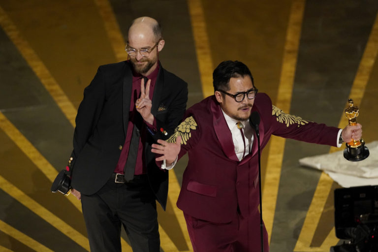 Daniel Kwan (vľavo) a Daniel Scheinert počas 95. ročníka udeľovania cien americkej Akadémie filmových umení a vied (Oscar 2023). Los Angeles (Dolby Theatre), 12. marec 2023. Foto: Jordan Strauss/Invision/AP.