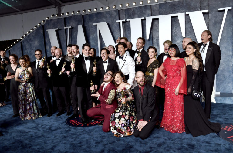 Predstavitelia filmu Všetko, všade, naraz prichádzajú na party po odovzdávaní Oscarov 2023. Beverly Hills, 12 marec 2023. Foto: Evan Agostini/Invision/AP.