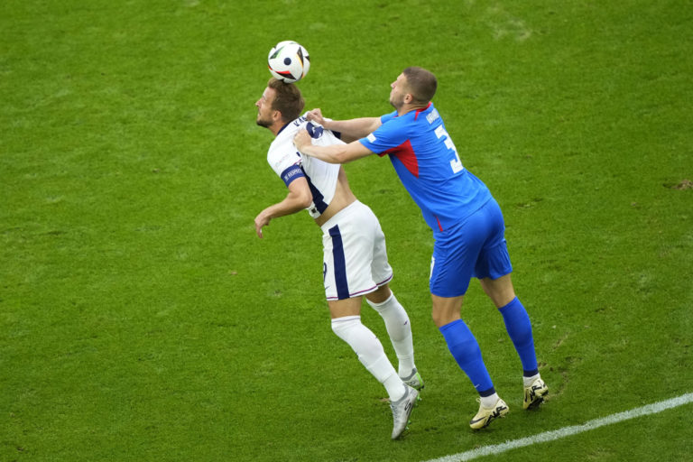 Anglický útočník Harry Kane v súboji so slovenským reprezentantom Denisom Vavrom počas osemfinálového zápasu na ME vo futbale 2024. Gelsenkirchen, 30. jún 2024. Foto: SITA/AP.