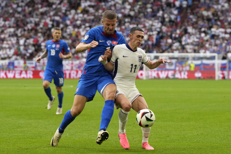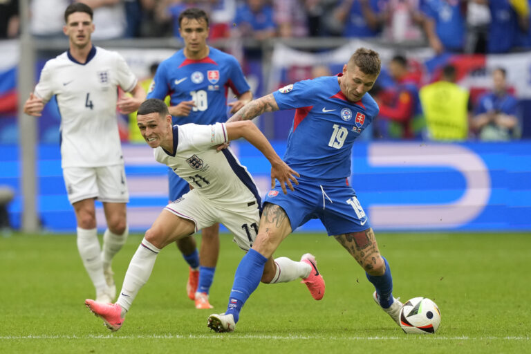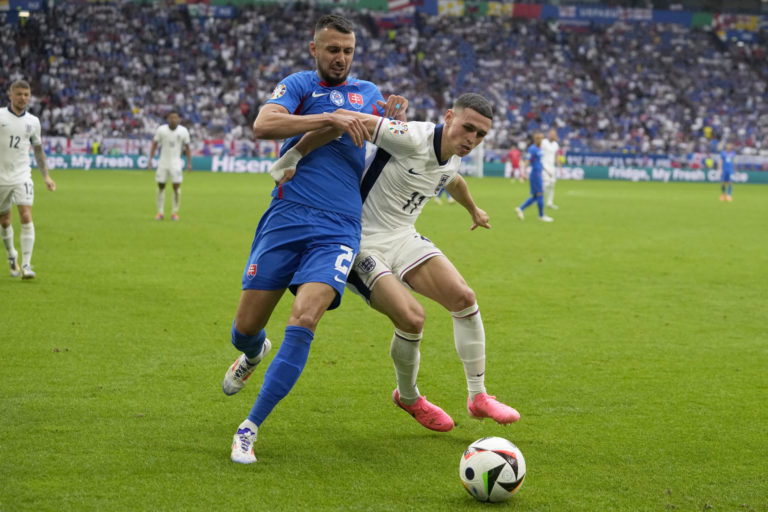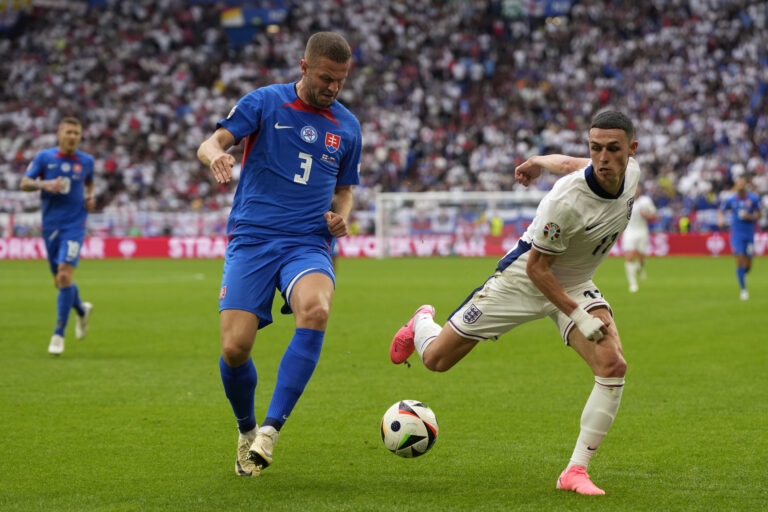 Slovenský reprezentant Peter Pekarík v súboji s Angličanom Philom Fodenom počas osemfinálového zápasu na ME vo futbale 2024. Gelsenkirchen, 30. jún 2024. Foto: SITA/AP.
