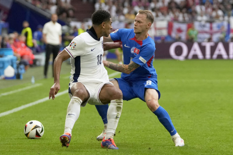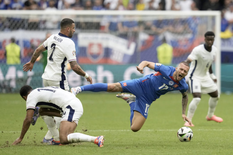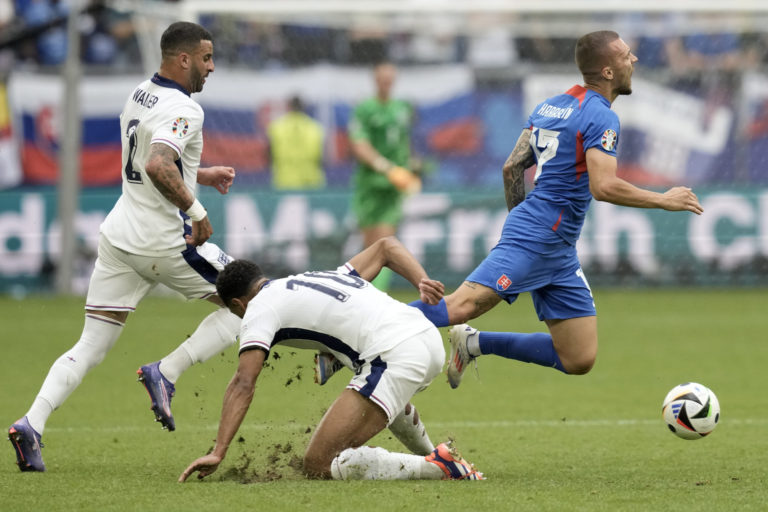 Slovenský reprezentant Lukáš Haraslín padá po súboji s Angličanom Judeom Bellinghamom počas osemfinálového zápasu na ME vo futbale 2024. Gelsenkirchen, 30. jún 2024. Foto: SITA/AP.