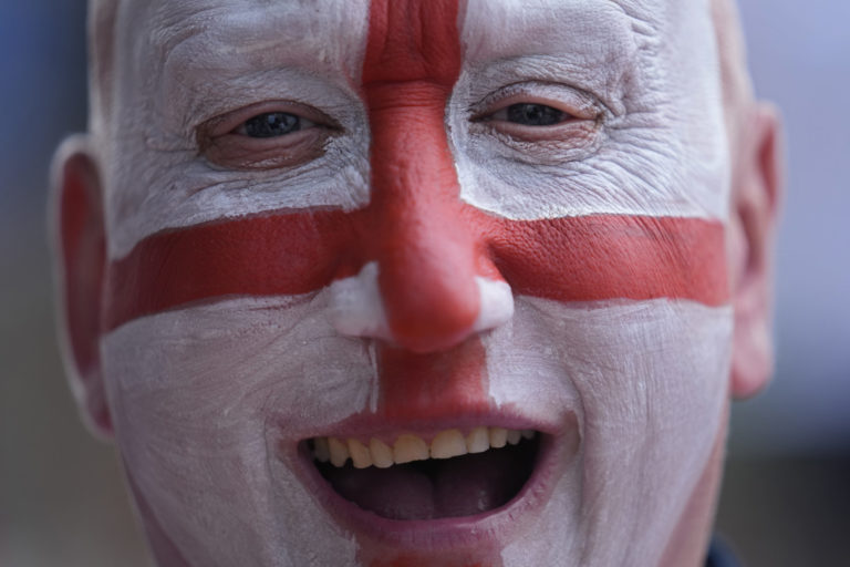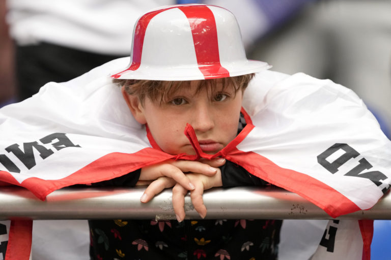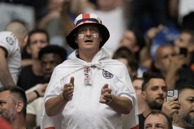 Fanúšik v hľadisku Veltins Areny pred zápasom Anglicko - Slovensko v osemfinále ME vo futbale 2024. Gelsenkirchen, 30. jún 2024. Foto: SITA/AP.