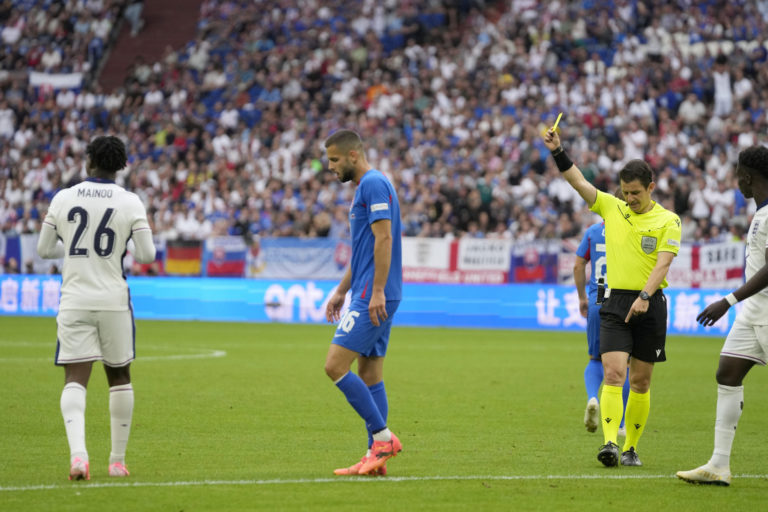 Anglický reprezentant Kobbie Mainoo dostáva žltú kartu od tureckého rozhodcu Umuta Melera v prvom polčase osemfinálového zápasu proti Slovensku na ME vo futbale 2024. Gelsenkirchen, 30. jún 2024. Foto: SITA/AP.