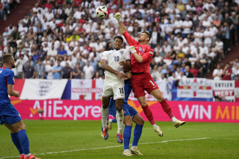 Zákrok slovenského brankára Martina Dúbravku v osemfinálovom zápase proti Anglicku na ME vo futbale 2024. Gelsenkirchen, 30. jún 2024. Foto: SITA/AP.