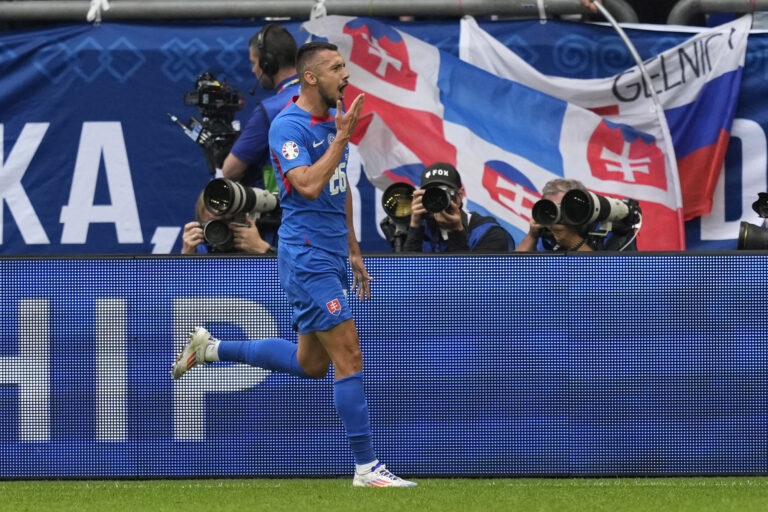 Slovenský reprezentant Ivan Schranz sa teší z gólu v sieti Anglicka počas osemfinálového zápasu na ME vo futbale 2024. Gelsenkirchen, 30. jún 2024. Foto: archívne, SITA/AP.