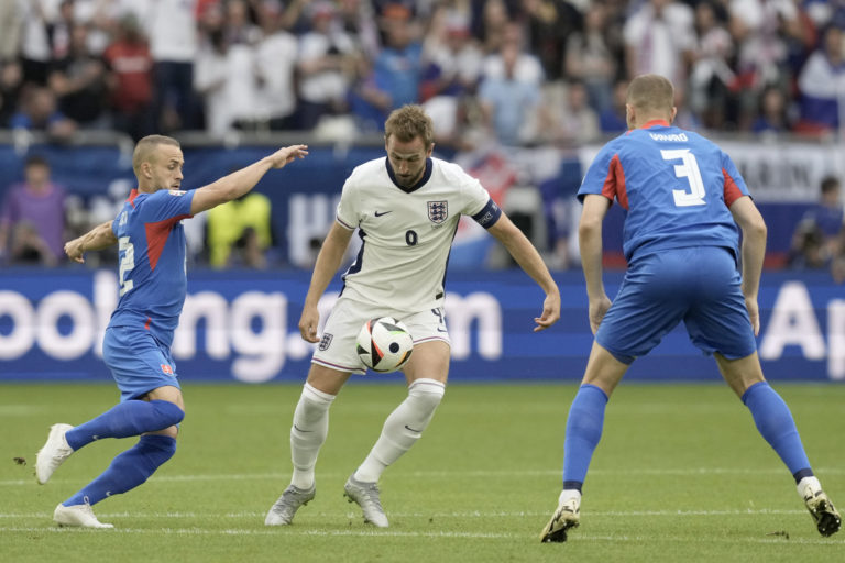 Slovenský reprezentant Denis Vavro sleduje súboj spoluhráča Stanislava Lobotku s Angličanom Harrym Kaneom počas osemfinálového zápasu na ME vo futbale 2024. Gelsenkirchen, 30. jún 2024. Foto: SITA/AP.