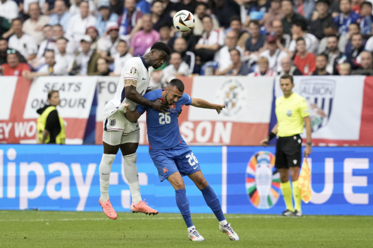 Slovenský reprezentant Dávid Hancko v hlavičkovom súboji s Angličanom Bukayom Sakom počas osemfinálového zápasu na ME vo futbale 2024. Gelsenkirchen, 30. jún 2024. Foto: SITA/AP.