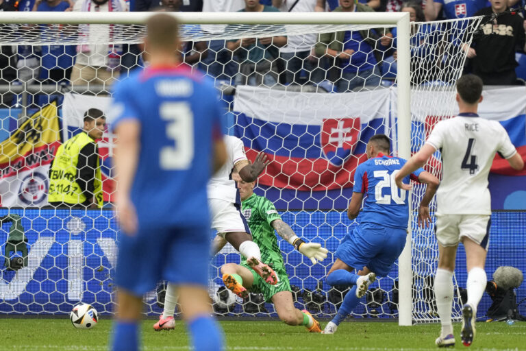Slovenský reprezentant Ivan Schranz prekonáva brankára Jordana Pickforda v prvom polčase osemfinálového zápasu proti Anglicku na ME vo futbale 2024. Gelsenkirchen, 30. jún 2024. Foto: SITA/AP