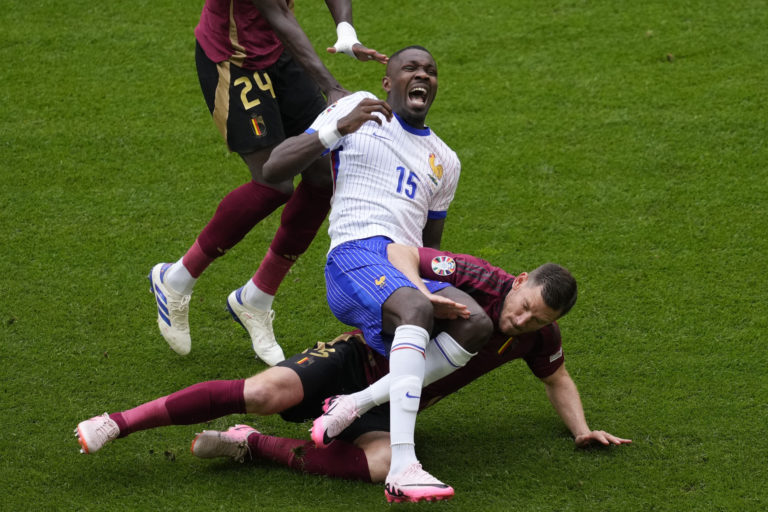 Francúzsky reprezentant Marcus Thuram padá po súboji s Belgičanom Janom Vertonghenom počas osemfinálového zápasu na ME vo futbale 2024. Düsseldorf, 1. júl 2024. Foto: SITA/AP.